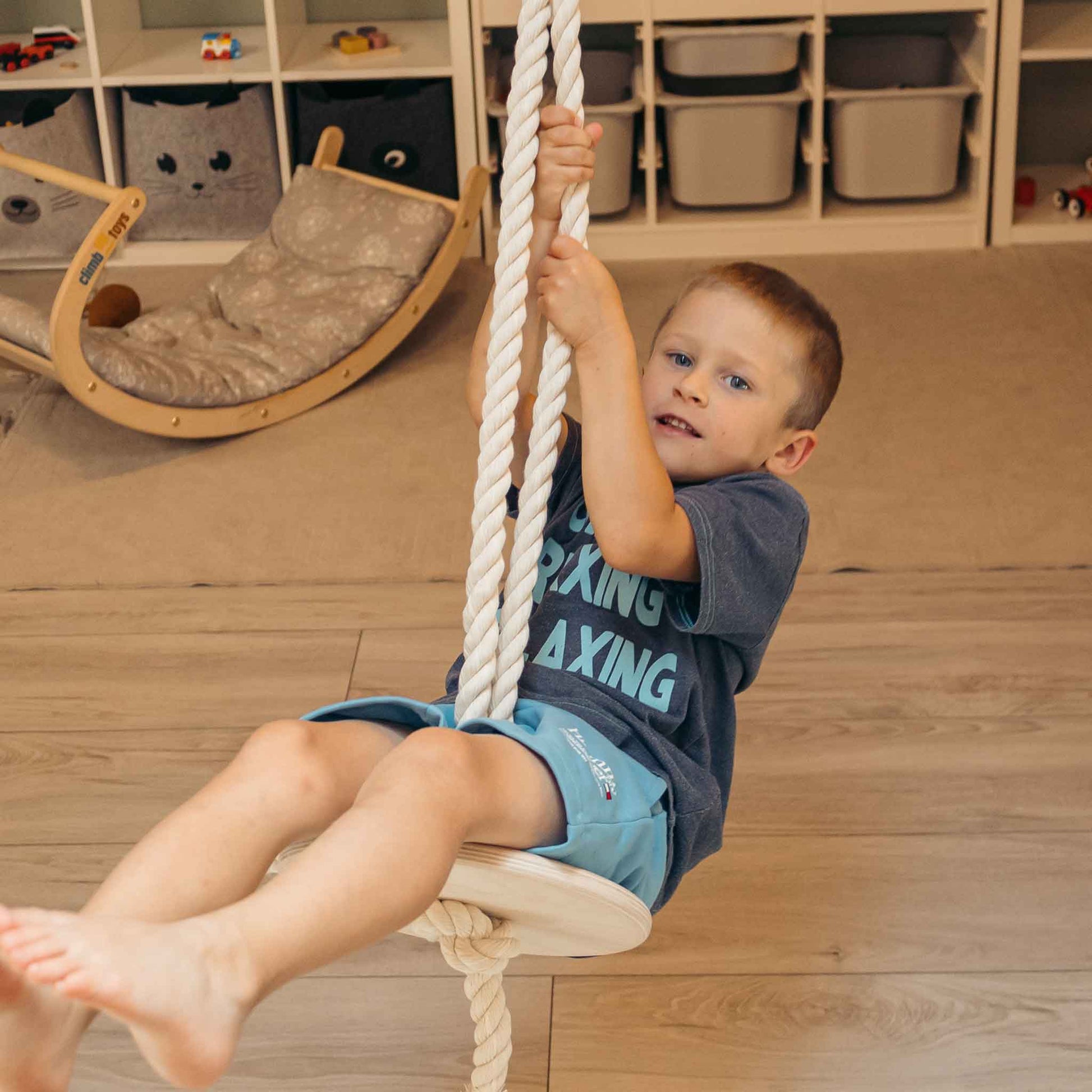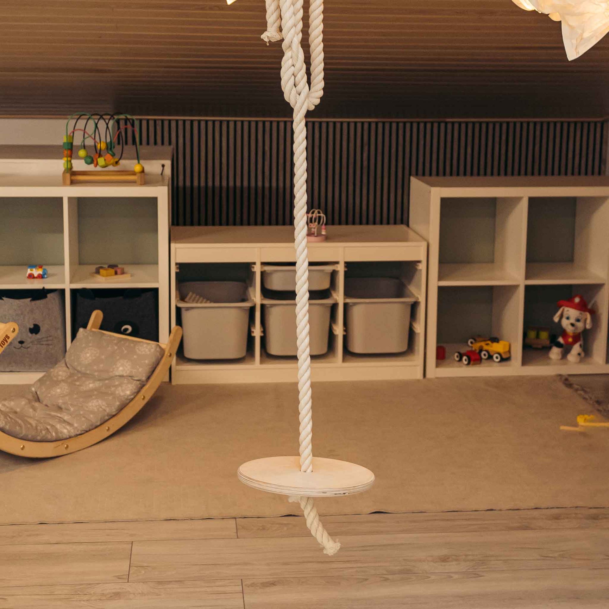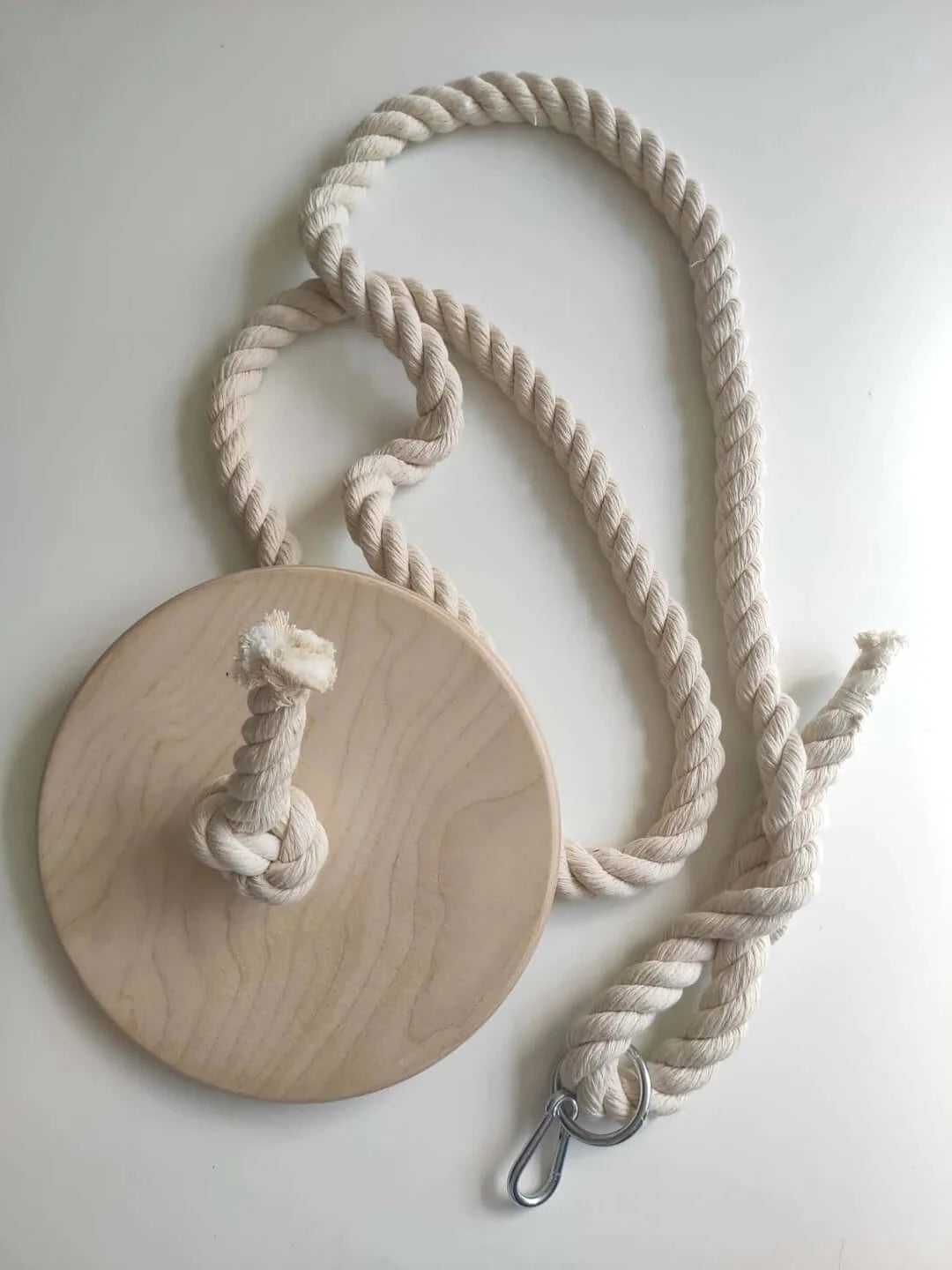 Disc swing: round wooden base with rope and carabiner. Fastening materials for ceilings such as screws and dowels are not included