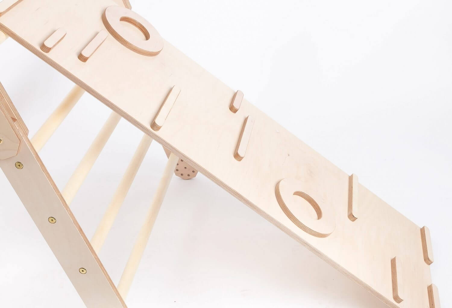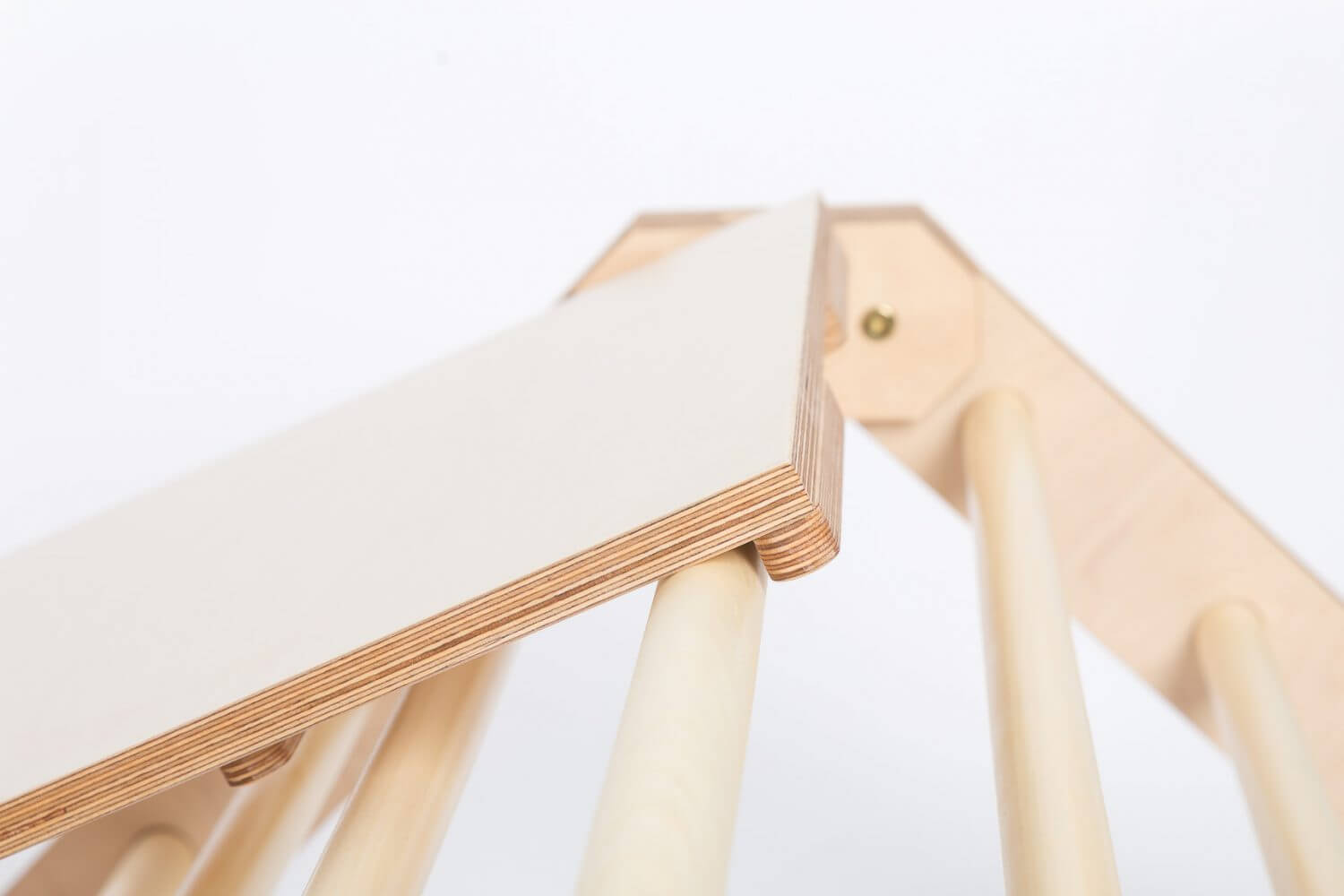De slaapklimmer is handgemaakt van 15 mm dik, natuurlijk en zeer duurzaam berkenmultiplex , dat een lange levensduur en veiligheid garandeert gedurende de hele levensduur. Het oppervlak van het materiaal heeft een transparante laminaatcoating van opaalwitte kleur die het natuurlijke patroon van het hout volledig behoudt en het daglicht zachtjes reflecteert. Het oppervlak is zeer glad, warm en aangenaam om aan te raken , tegelijkertijd is het materiaal zo hard dat krassen, schaafwonden of kleurvlekken worden vermeden . De randen zijn behandeld met natuurlijke, iets donkerdere natuurlijke olie , waardoor de vintage stijl goed herkenbaar is in het interieur.