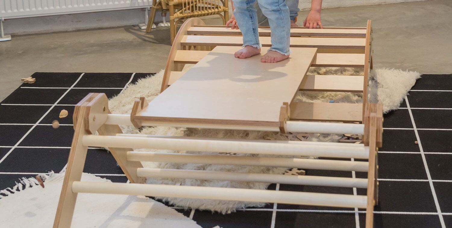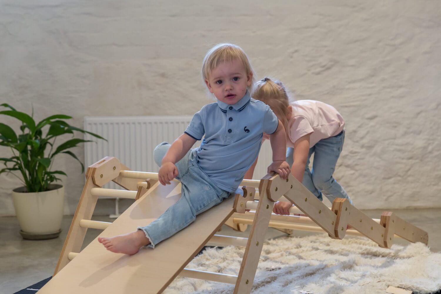 Deze dubbelzijdige helling/glijbaan heeft zowel een glad oppervlak om te glijden als verhoogde hand- en voetgrepen die ideaal zijn voor kleine handjes om te oefenen tijdens het klimmen .