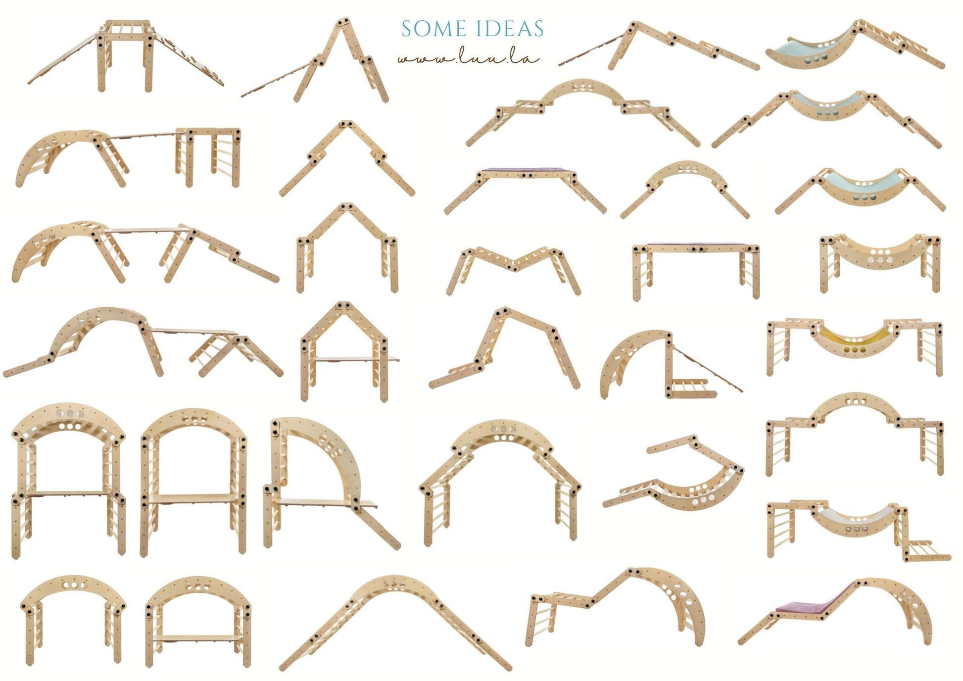 Met behulp van vier speciale verbindingsstukken kunnen de zijden van de driehoek in lengte worden aangepast, waardoor verschillende geometrische combinaties ontstaan ​​die passen bij de leeftijd en voorkeuren van de kinderen – hij kan hoger/korter, complexer/eenvoudiger zijn. De verbindingsstukken zorgen ook voor extra stabiliteit bij actief gebruik. Bovendien is de constructie dankzij het ontwerp eenvoudig op te vouwen en ruimtebesparend op te bergen.
