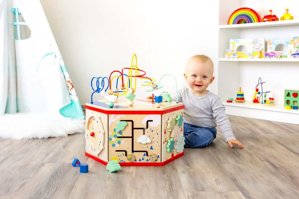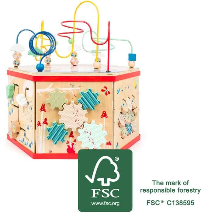 Plezier in het exclusieve kleine voetdesign! Deze hoogwaardige motoriekkubus van FSC® 100%-gecertificeerd hout overtuigt aan alle kanten door zijn hoge speelwaarde, want er valt zoveel te ontdekken voor kleine ontdekkingsreizigers: