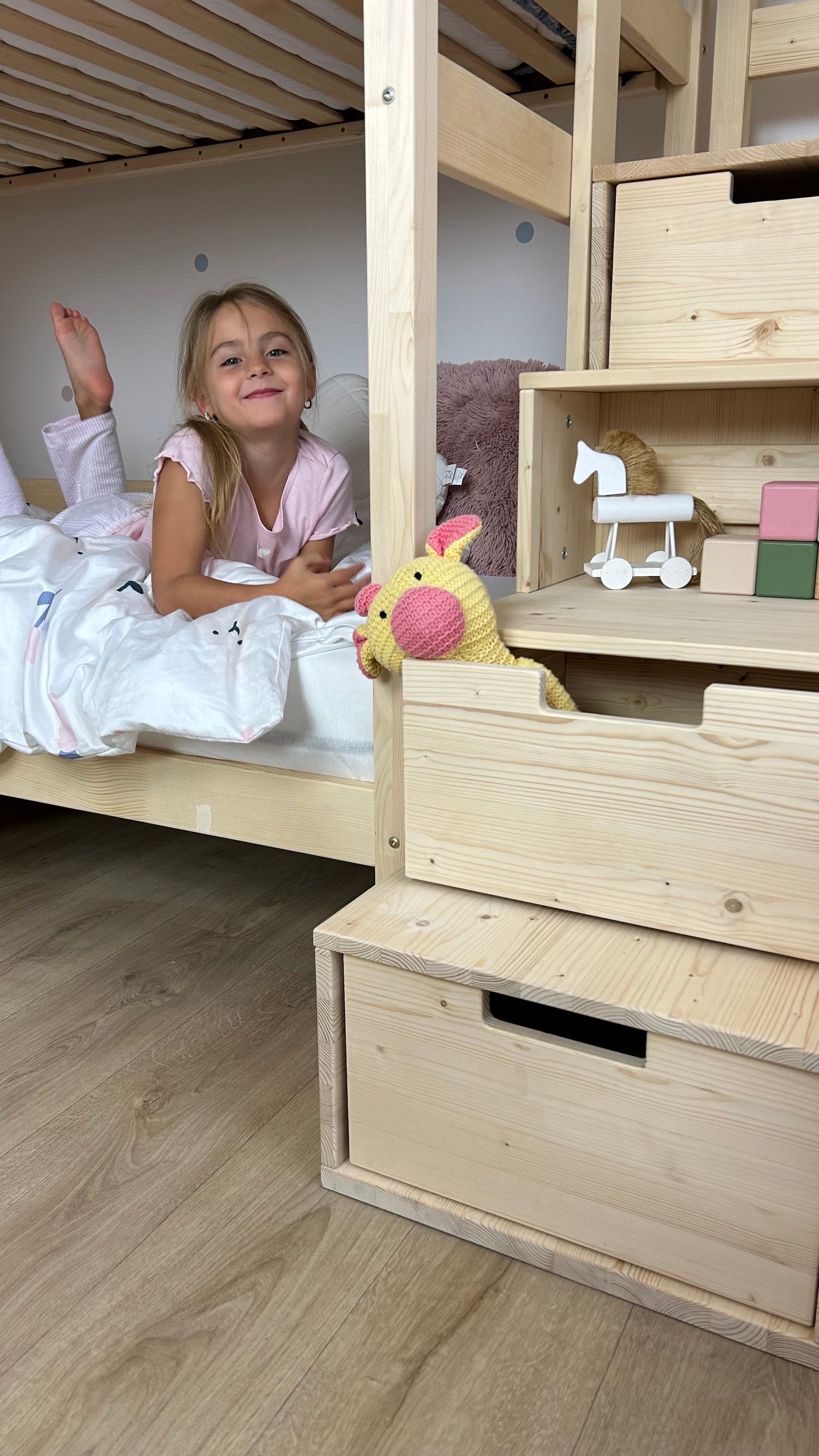 Die seitlichen Stufen mit integriertem Regal und Schubladen machen den Weg ins obere Bett besonders angenehm und sicher. Gleichzeitig bieten sie praktischen Stauraum für all die kleinen Schätze wie Kuscheltiere, Lieblingsbücher oder Spielzeug. Je nach Raumkonzept kannst du die Treppe flexibel links oder rechts am Bett anbringen.