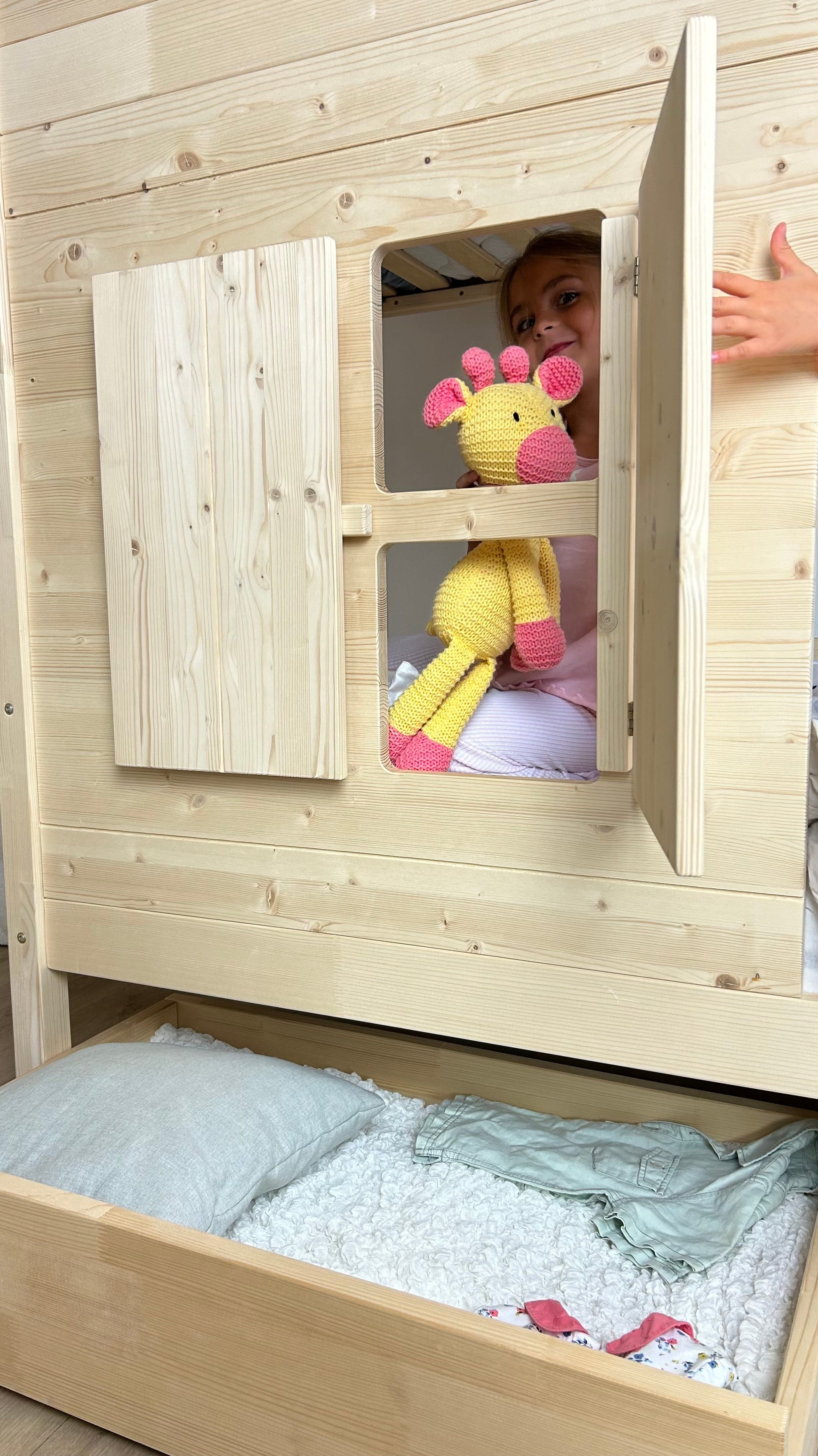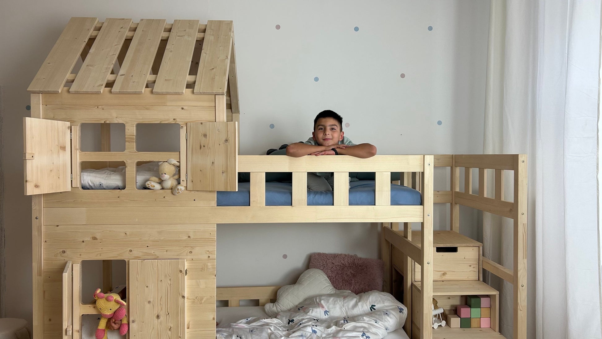 Stell dir vor, dein Kind darf jede Nacht in einem eigenen Häuschen schlafen – mit Dach, Fenstern und liebevollen Fensterläden, die Gemütlichkeit und Abenteuerlust zugleich versprühen. Genau dieses Gefühl vermittelt das Holz-Etagenbett HOLIDAY: ein Ort zum Schlafen, Spielen und Wohlfühlen, der Geborgenheit schenkt und Fantasie beflügelt.