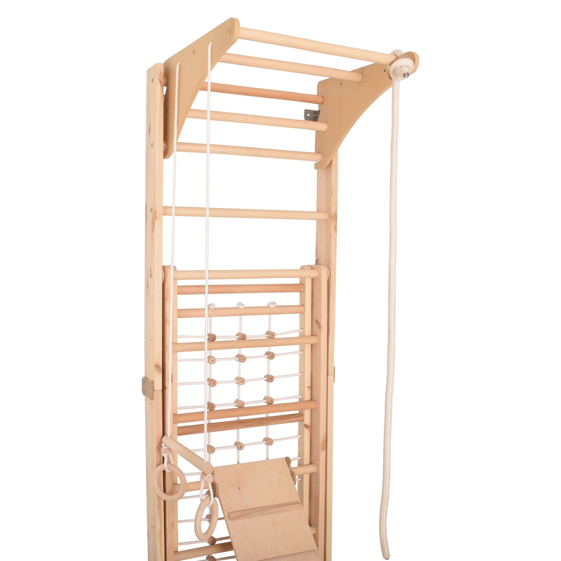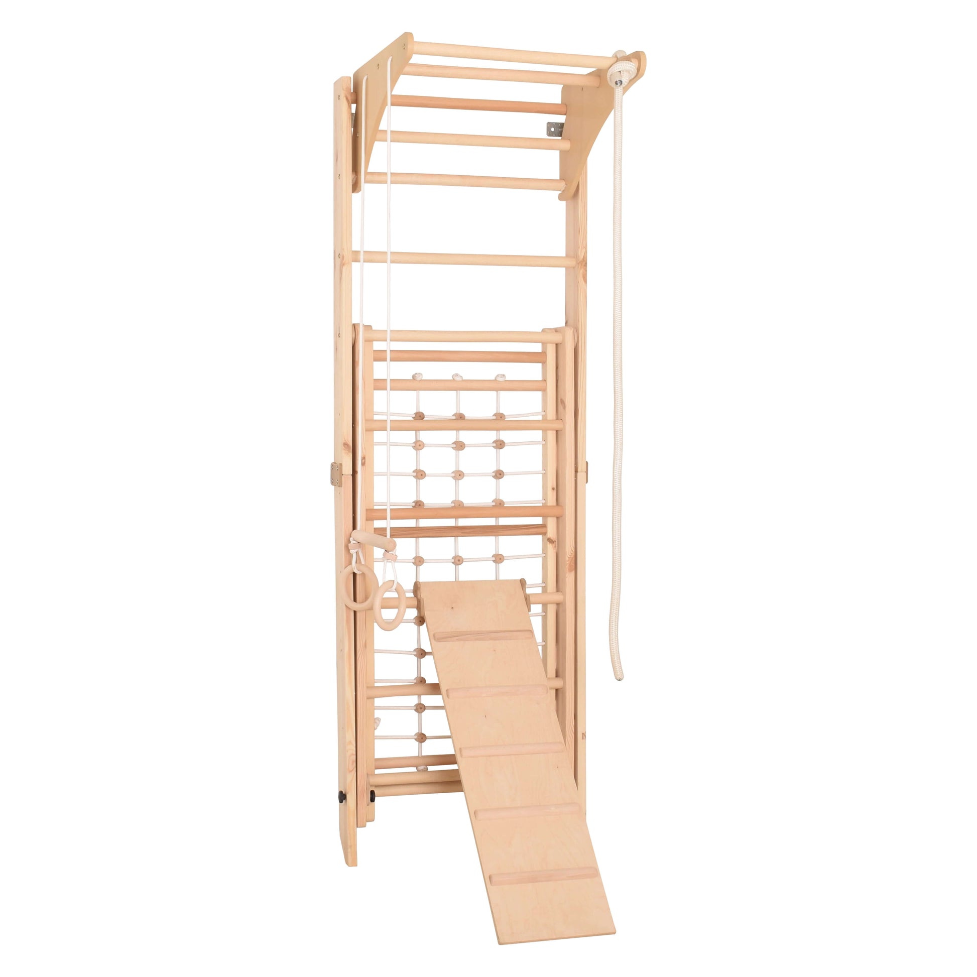Entdecke die unendlichen Möglichkeiten, die dieses indoor Klettergerüst für Kinderzimmer bietet. Erkunde und spiele gemeinsam mit deinem Kind auf Turnringen, Schwedenleiter, Kletternetz und Rutsche.