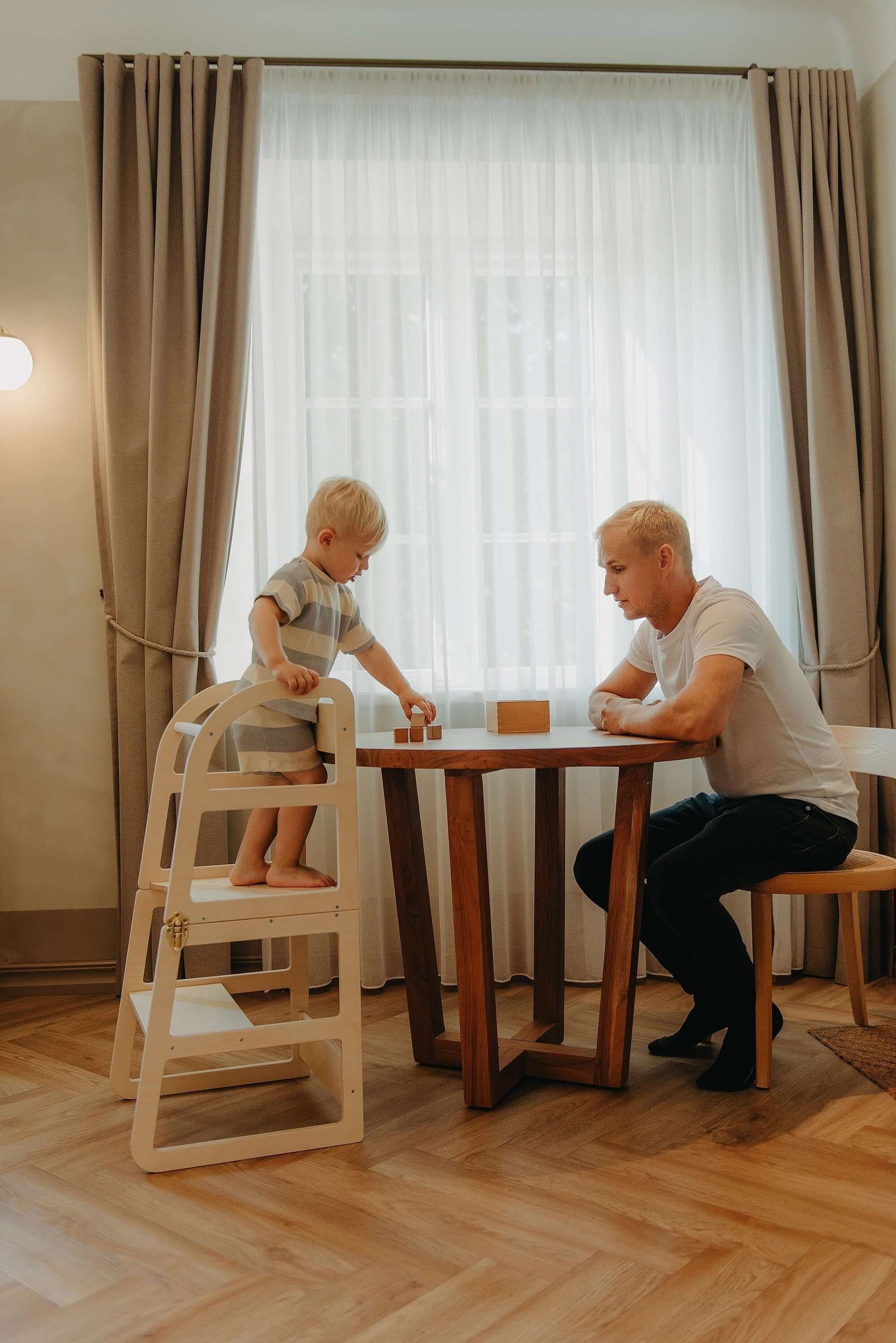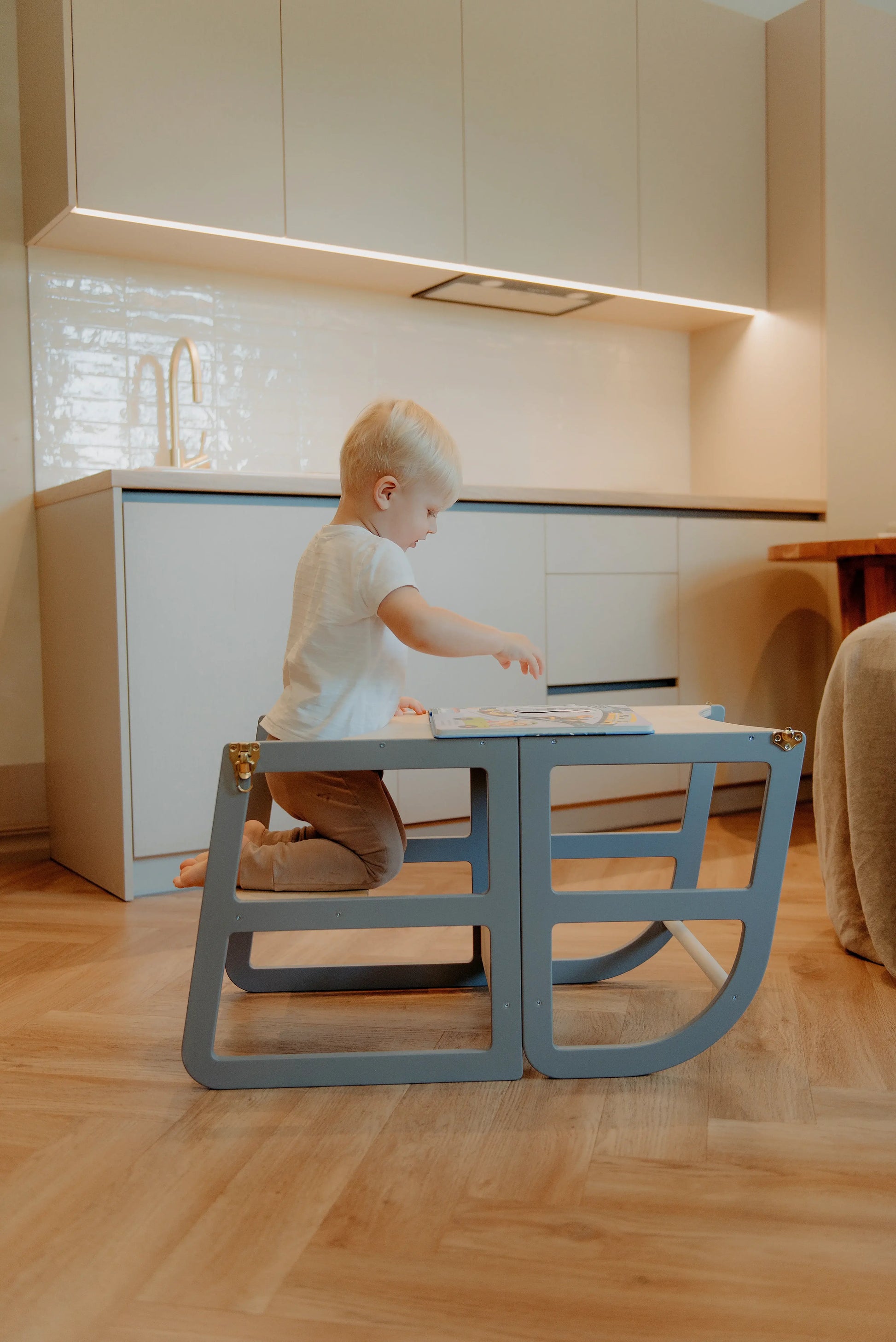 Mit nur einem Handgriff verwandelst du den Turm in einen kindgerechten Tisch mit Stuhl – ideal zum Malen, Spielen oder für kleine Snackpausen.