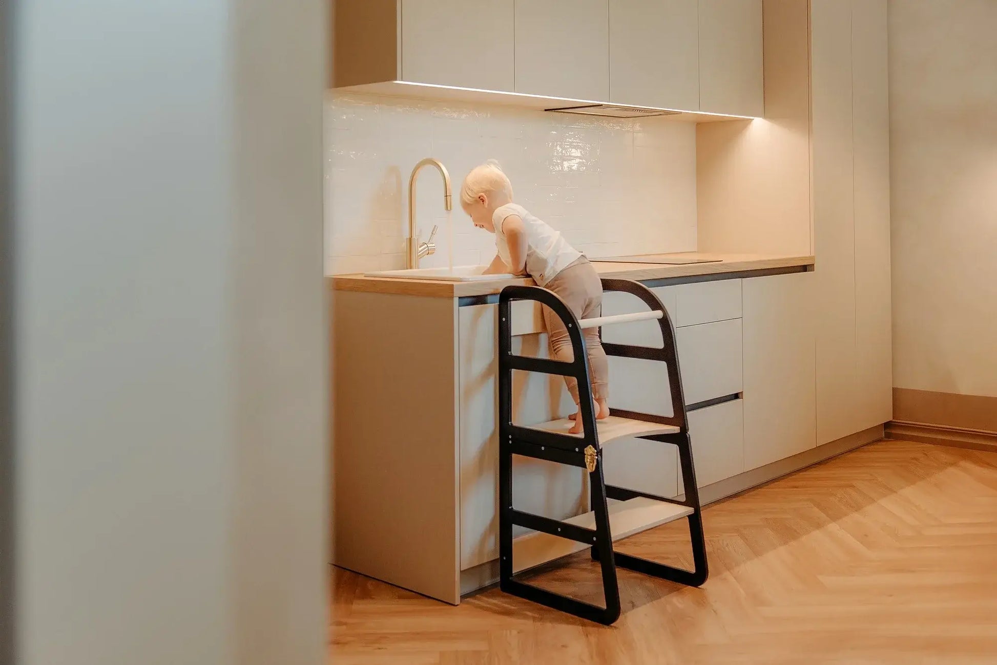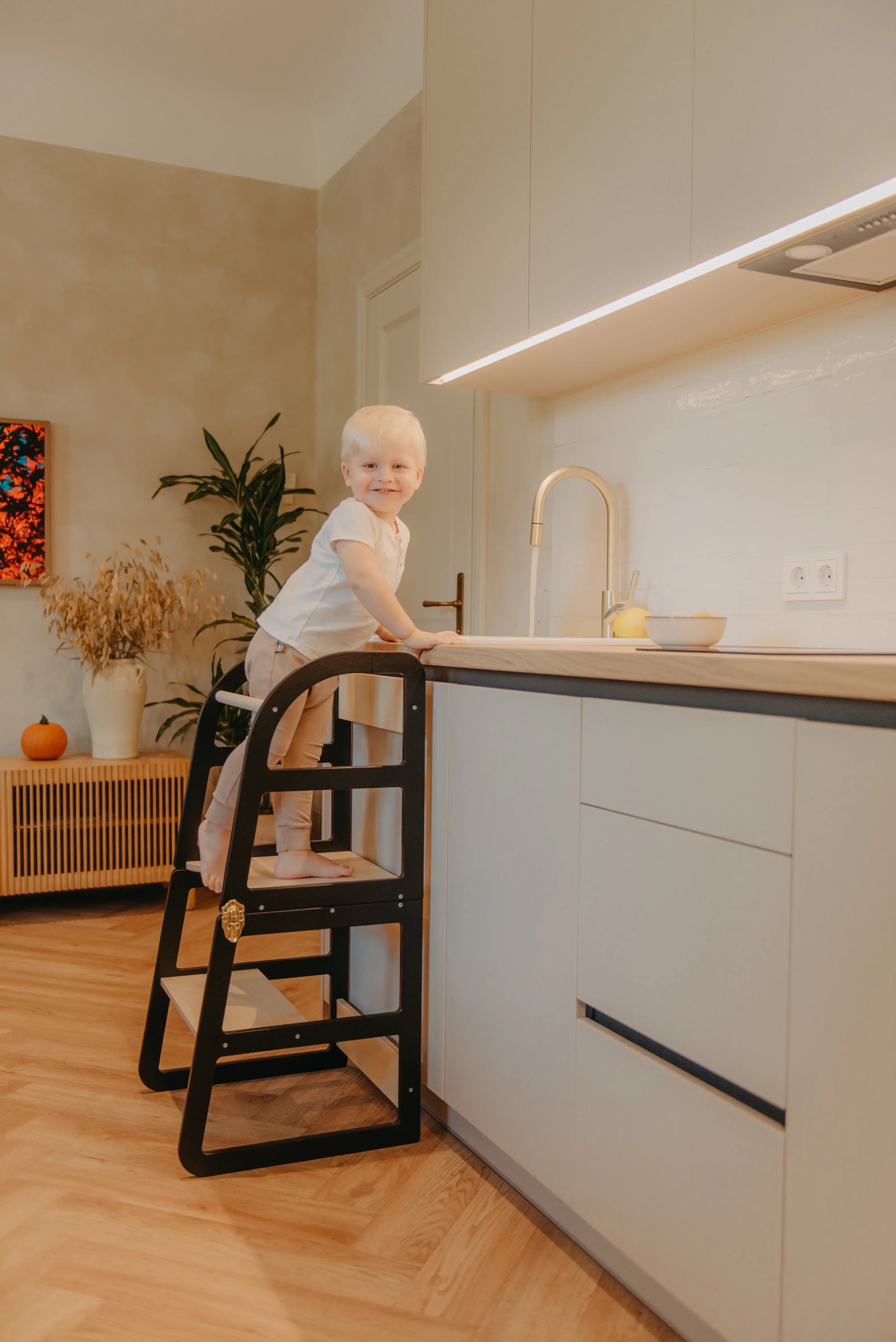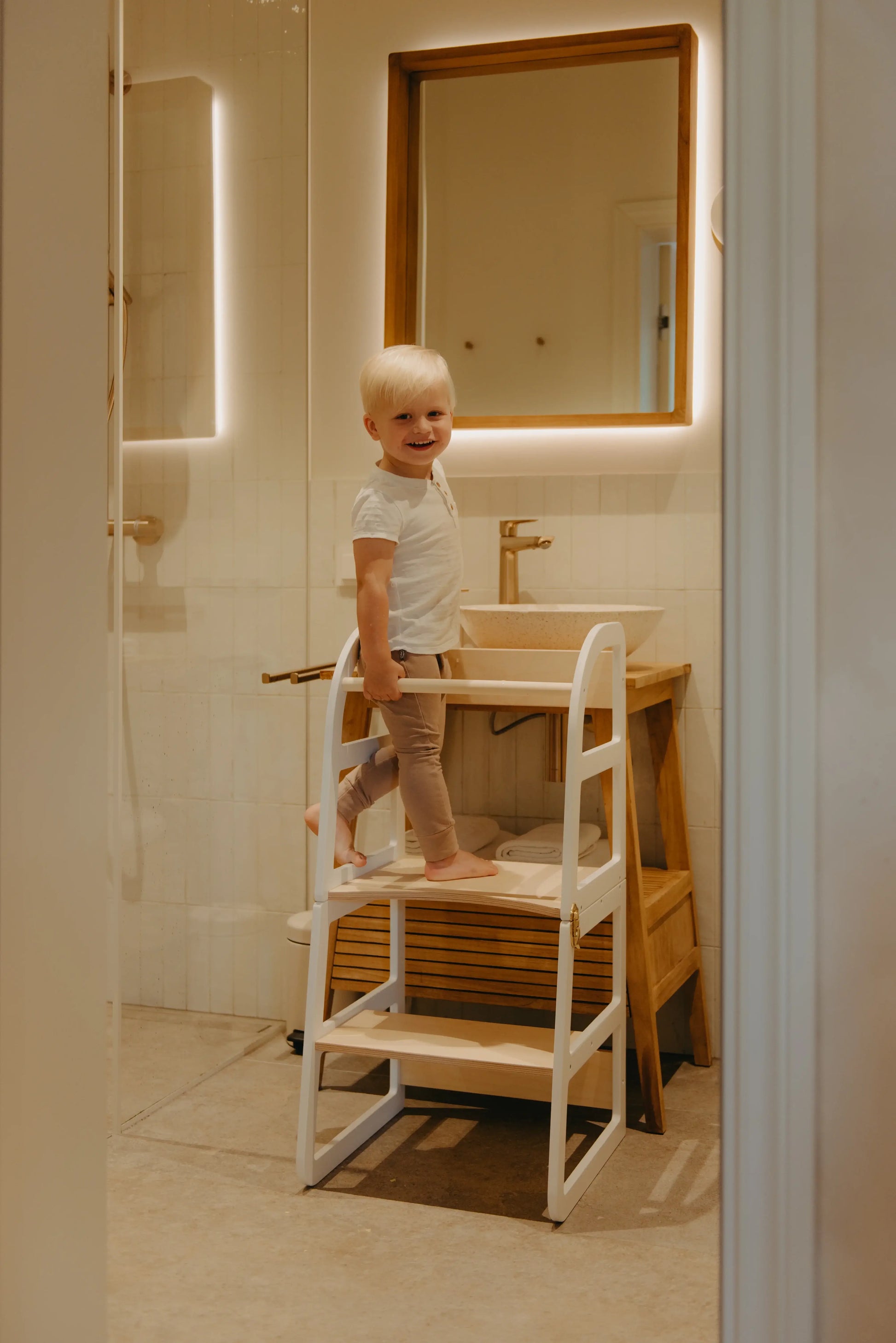 Unser verwandlungsfähiger Lernturm ist mehr als nur ein Küchenhelfer – er ist der perfekte Begleiter für kleine Alltagsabenteuer.