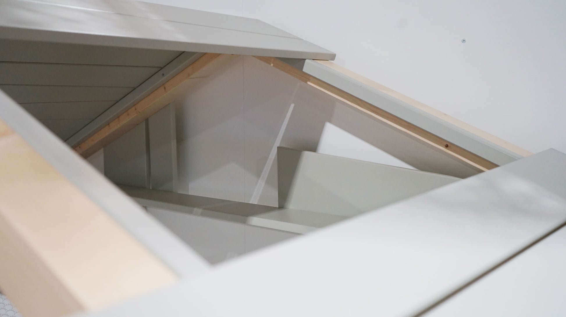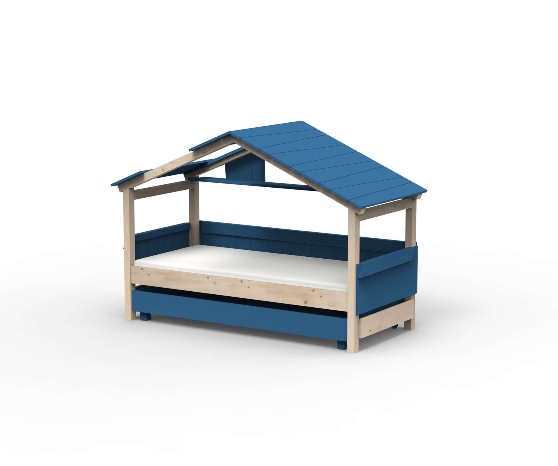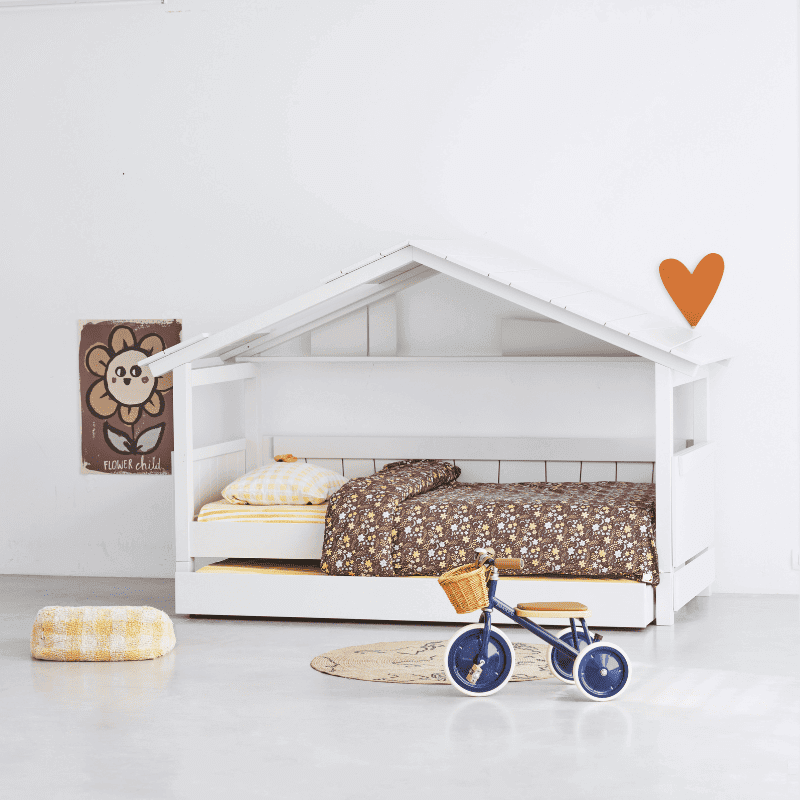Ob zum Träumen, für spannende Bilderbuchreisen oder als Bühne für Rollenspiele – das Starlight Hausbett passt sich mühelos den Bedürfnissen deines Kindes an und wird schnell zum Lieblingsort im Kinderzimmer. Ein kleines Regal oben im Dach bietet Platz für kleine Bücher, oder Kuscheltiere.