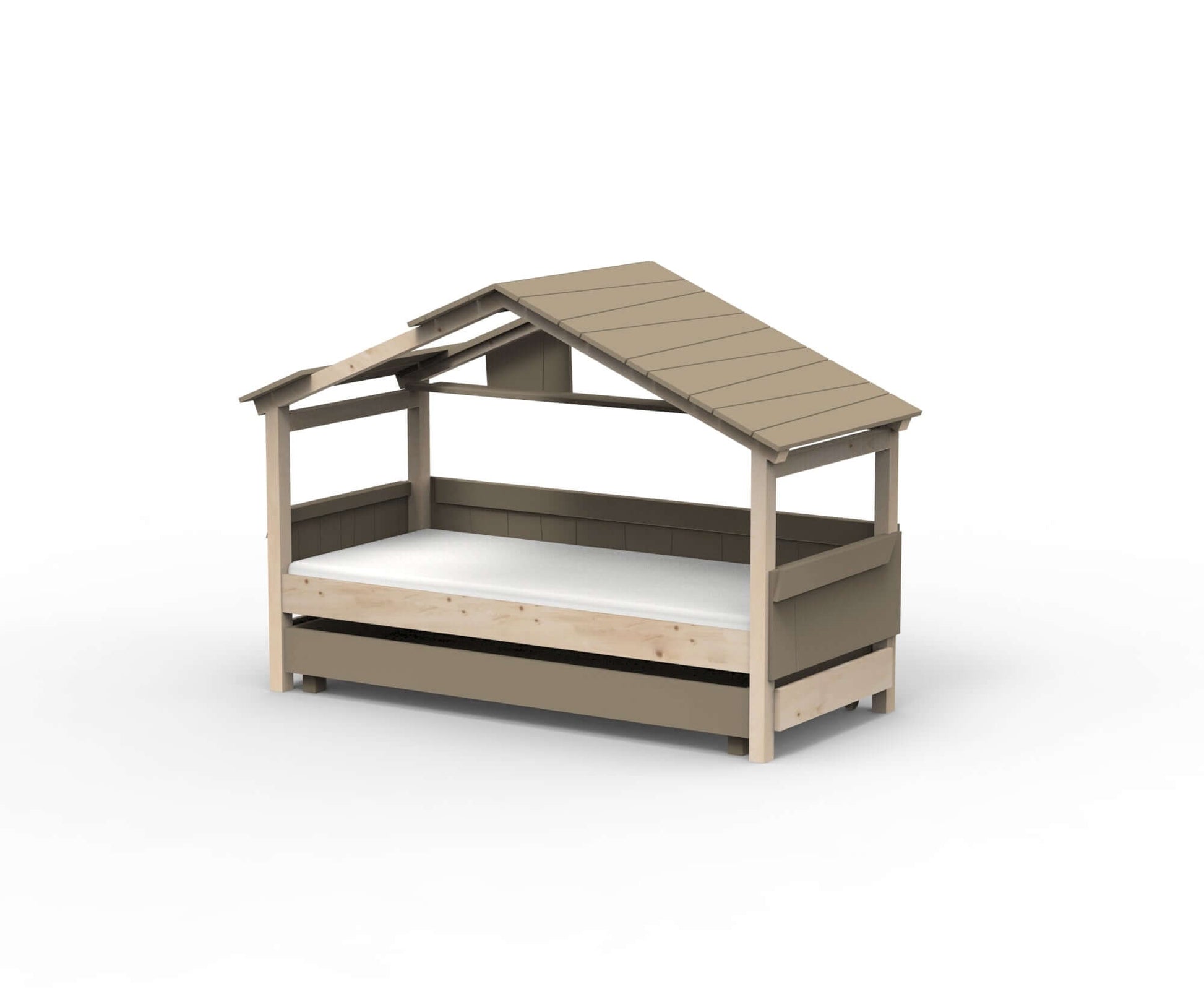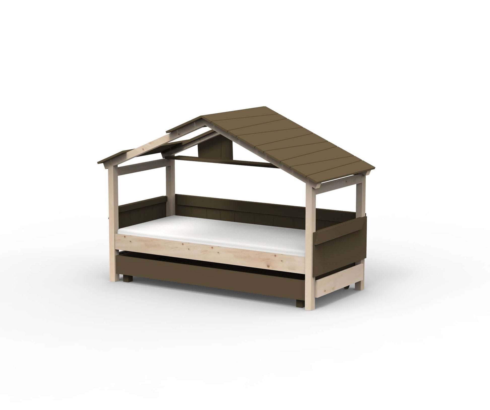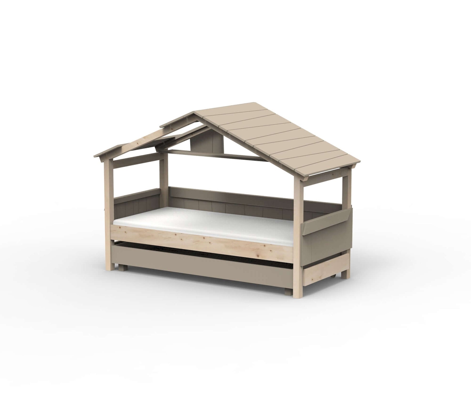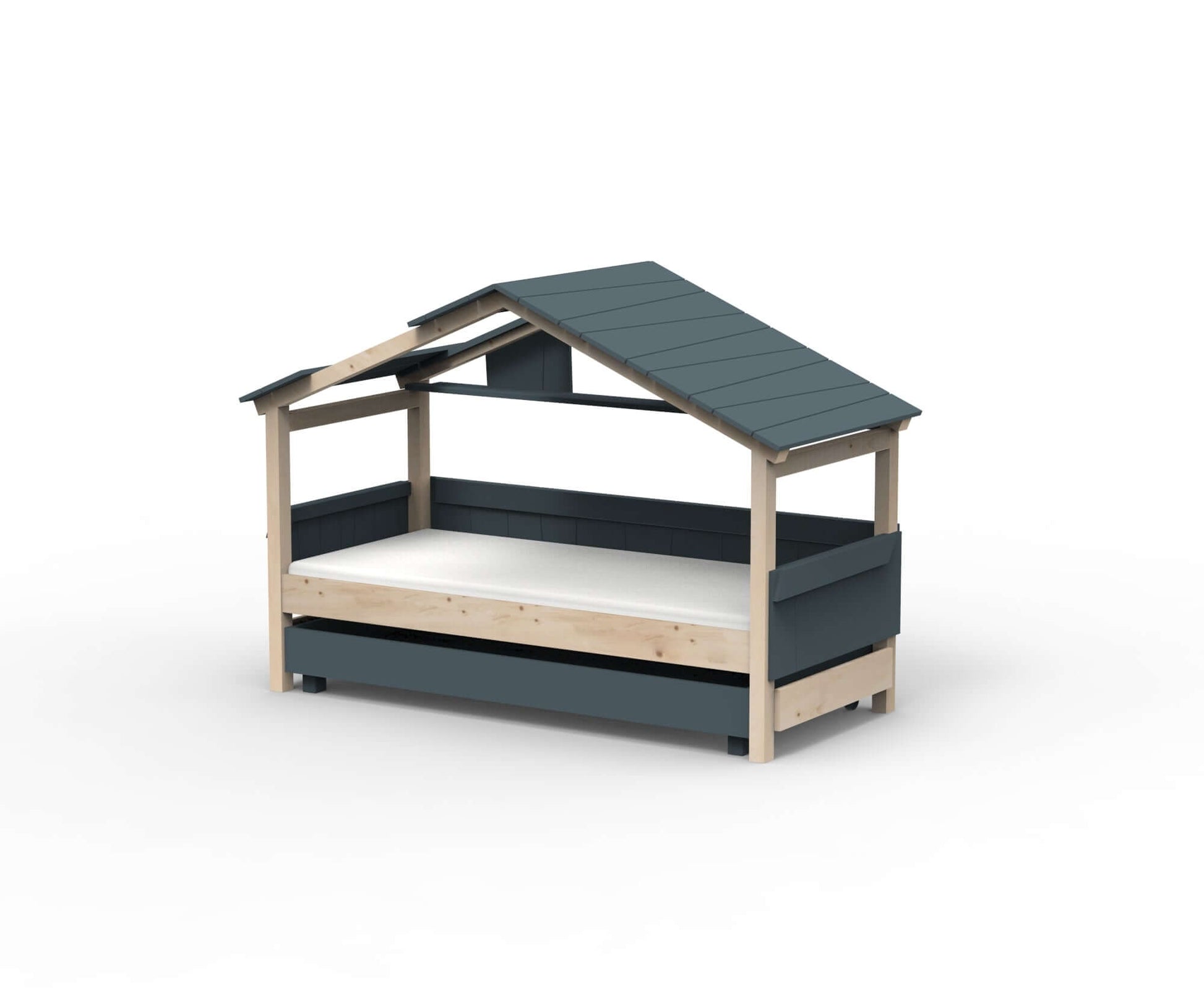 Inspiriert von der Montessori-Pädagogik, lädt das Bett schon die Kleinsten dazu ein, selbstständig hinein- und herauszuklettern. Das Besondere: Das Dach mit Paneelen im lebendigen Baumhaus-Look. Bewusst unregelmäßig gefertigt, entsteht eine authentische, warme Atmosphäre – fast wie in einem echten Abenteuerhaus.